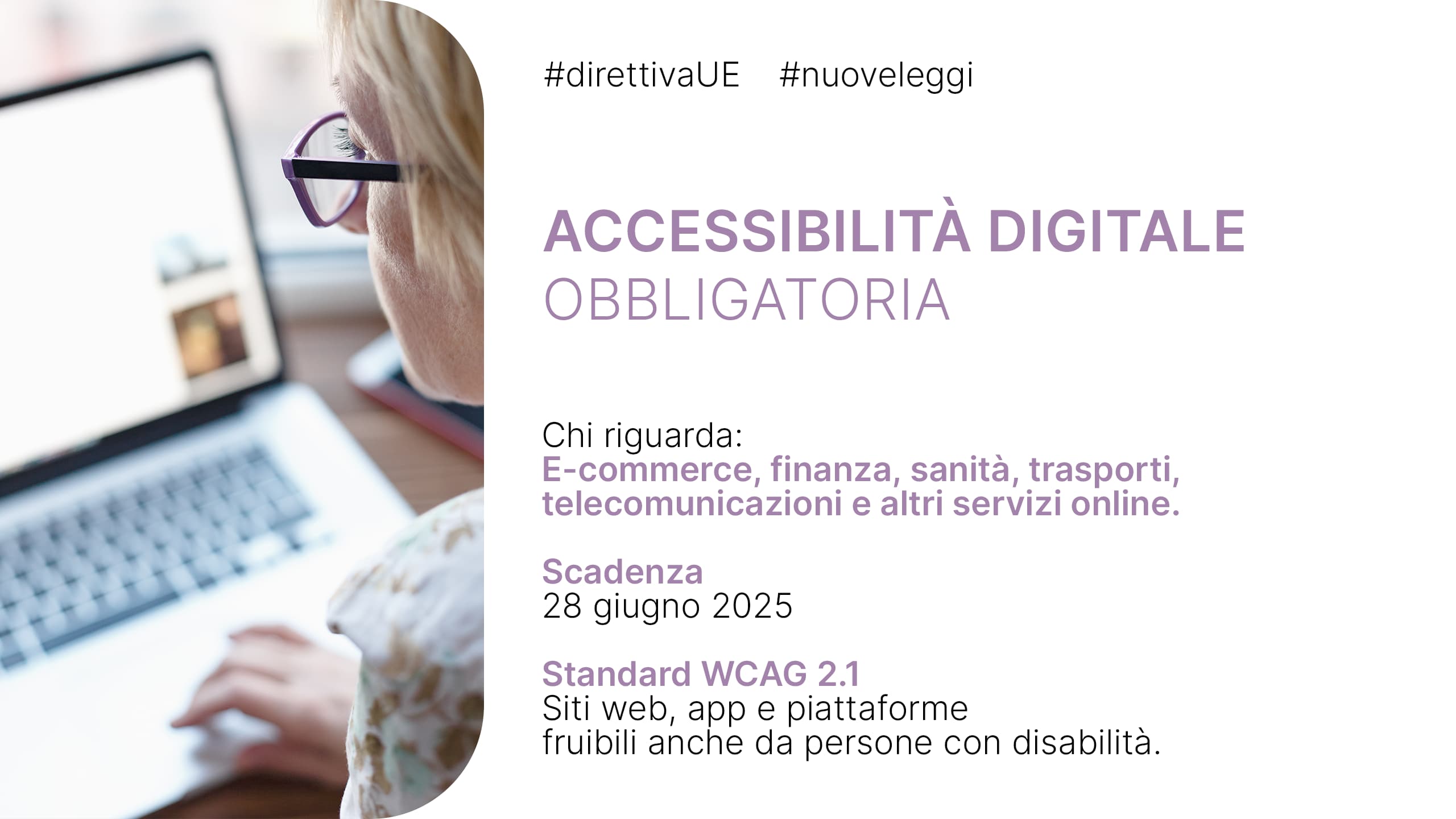 30 Settembre 2025 Nuovi obblighi per le aziende che hanno un sito web. Le nuove regole circa l’”accessibilità digitale” Cos’è l’accessibilità digitale L’accessibilità digitale consiste nel rendere siti web, e-commerce, app e servizi digitali fruibili anche da persone con disabilità — motorie, visive, uditive o cognitive. Significa garantire a tutti un accesso equo ai contenuti e alle funzionalità, rimuovendo barriere tecniche e di design. Un sito accessibile è: Navigabile da tastiera e screen reader, Strutturato in modo chiaro e coerente, Conforme agli standard internazionali (WCAG 2.1), Pensato per essere usabile da tutti, in qualunque condizione. L’Unione Europea ha introdotto la Direttiva 2019/882 (European Accessibility Act), che rende obbligatoria l’accessibilità digitale per molte aziende a partire dal 28 giugno 2025. Chi è coinvolto: Aziende private con più di 10 dipendenti o oltre 2 milioni di euro di fatturato annuo; Realtà che operano in settori come e-commerce, servizi bancari e finanziari, assicurazioni, sanità, trasporti, telecomunicazioni e servizi digitali. Sono esclusi i siti puramente vetrina o le imprese che non offrono servizi digitali al pubblico dei consumatori privati. Cosa comporta la normativa Le aziende soggette alla normativa dovranno verificare la conformità dei propri canali digitali e, se necessario, procedere con adeguamenti tecnici, formativi e progettuali. Attenzione perché in caso di mancata conformità, sono previste sanzioni fino al 5% del fatturato annuo! Oltre a risarcimenti danni che i singoli utenti potranno richiedere!
