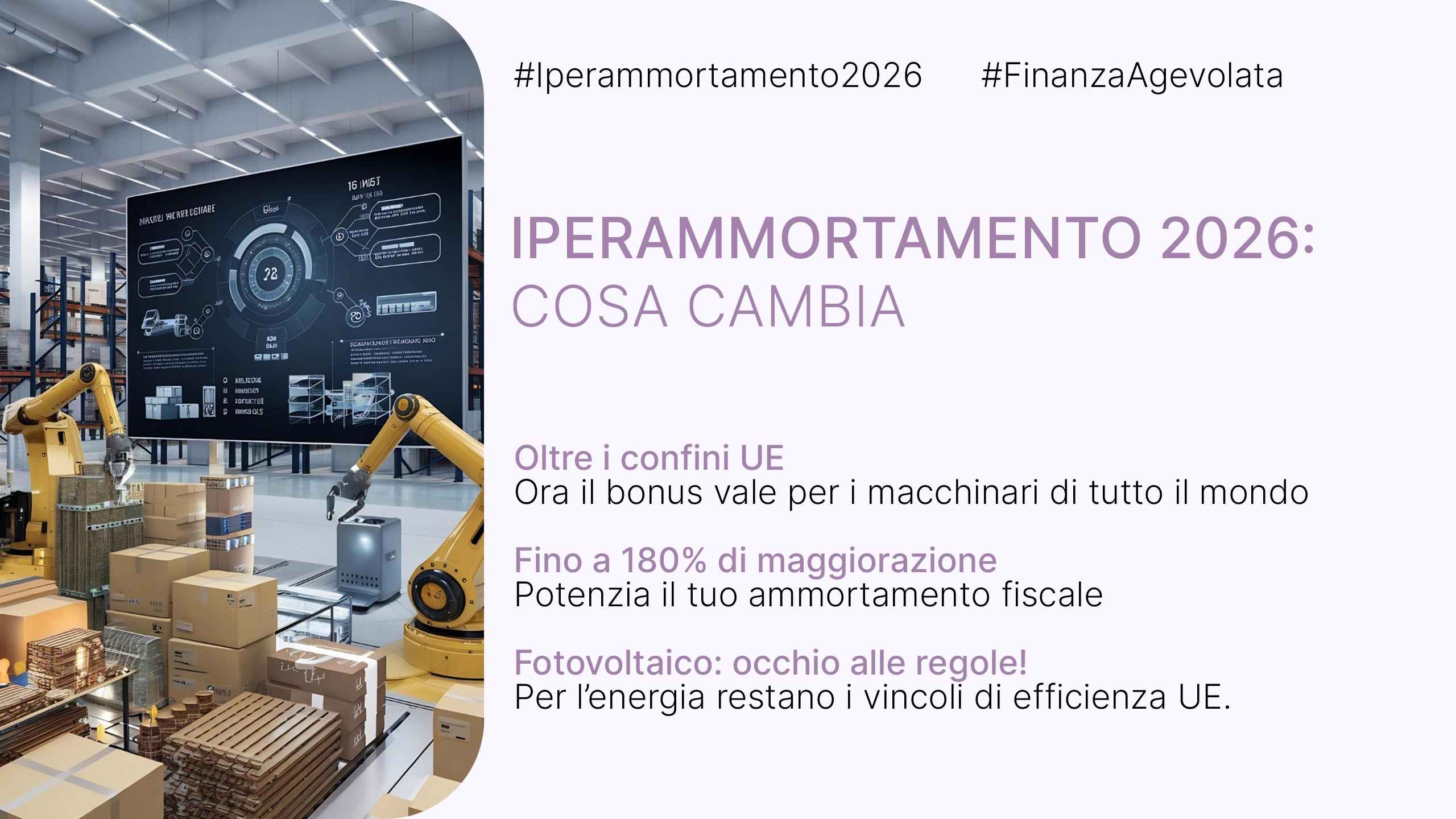 27 Aprile 2026 Iperammortamenti 2026: eliminato il vincolo sulla produzione dei beni Il Decreto Fiscale interviene sulla disciplina degli iperammortamenti prevista dalla Legge di Bilancio 2026, introducendo una modifica rilevante per le imprese. Via il vincolo geografico Con effetto retroattivo dal 1° gennaio 2026, viene eliminato il requisito che limitava l’agevolazione ai beni prodotti nell’Unione Europea o nello Spazio Economico Europeo. Gli iperammortamenti sono quindi riconosciuti indipendentemente dal luogo di produzione dei beni, a condizione che siano destinati a strutture produttive situate in Italia. Come funziona l’agevolazione La misura consente di maggiorare il costo fiscale dei beni 4.0 e 5.0, con effetti sulla determinazione delle quote di ammortamento e dei canoni di leasing. Sono agevolabili gli investimenti effettuati tra il 1° gennaio 2026 e il 30 settembre 2028 in: beni materiali e immateriali 4.0; beni per l’autoproduzione di energia da fonti rinnovabili; beni destinati a strutture produttive in Italia. Le percentuali di maggiorazione Il beneficio varia in base all’investimento: 180% fino a 2,5 milioni di euro 100% tra 2,5 e 10 milioni 50% tra 10 e 20 milioni Attenzione agli impianti fotovoltaici Per gli impianti legati all’autoproduzione di energia solare restano requisiti specifici. In particolare, i moduli fotovoltaici devono essere prodotti nell’Unione Europea e rispettare determinati livelli di efficienza. Conclusione L’eliminazione del vincolo geografico amplia le opportunità per le imprese, ma richiede comunque una valutazione attenta, soprattutto nei casi in cui si applicano requisiti tecnici specifici.Per valutare la convenienza dell’agevolazione e verificare i requisiti applicabili al tuo caso, contattaci per una consulenza.